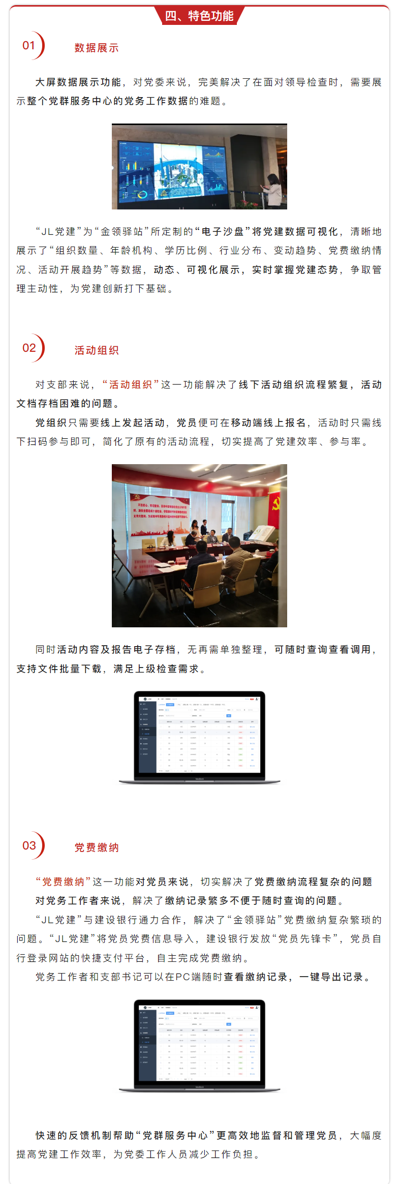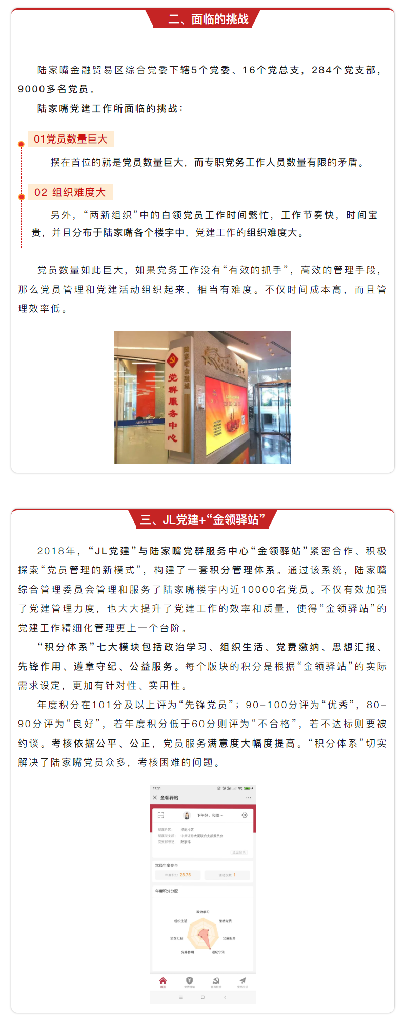 陆家嘴党建服务中心基于疆莱团队开发的党建积分管理系统(曾用名:金领驿站)开展工作,依托平台“宣传、管理、工作、学习、互动、考核、展示”七大模块开展事务性工作和组织管理,建立了金领驿站的党建秩序,强化了辖区内党员与党组织的纽带关系,大幅度提升了党务工作人员的工作效率,创新了数字化党建工作模式,成为陆家嘴党建创新工作机制和工作内容的关键部分,受到国家主席习近平、国家政治局常委韩正、原国家组织部部长齐玉等领导人的批示和认可。