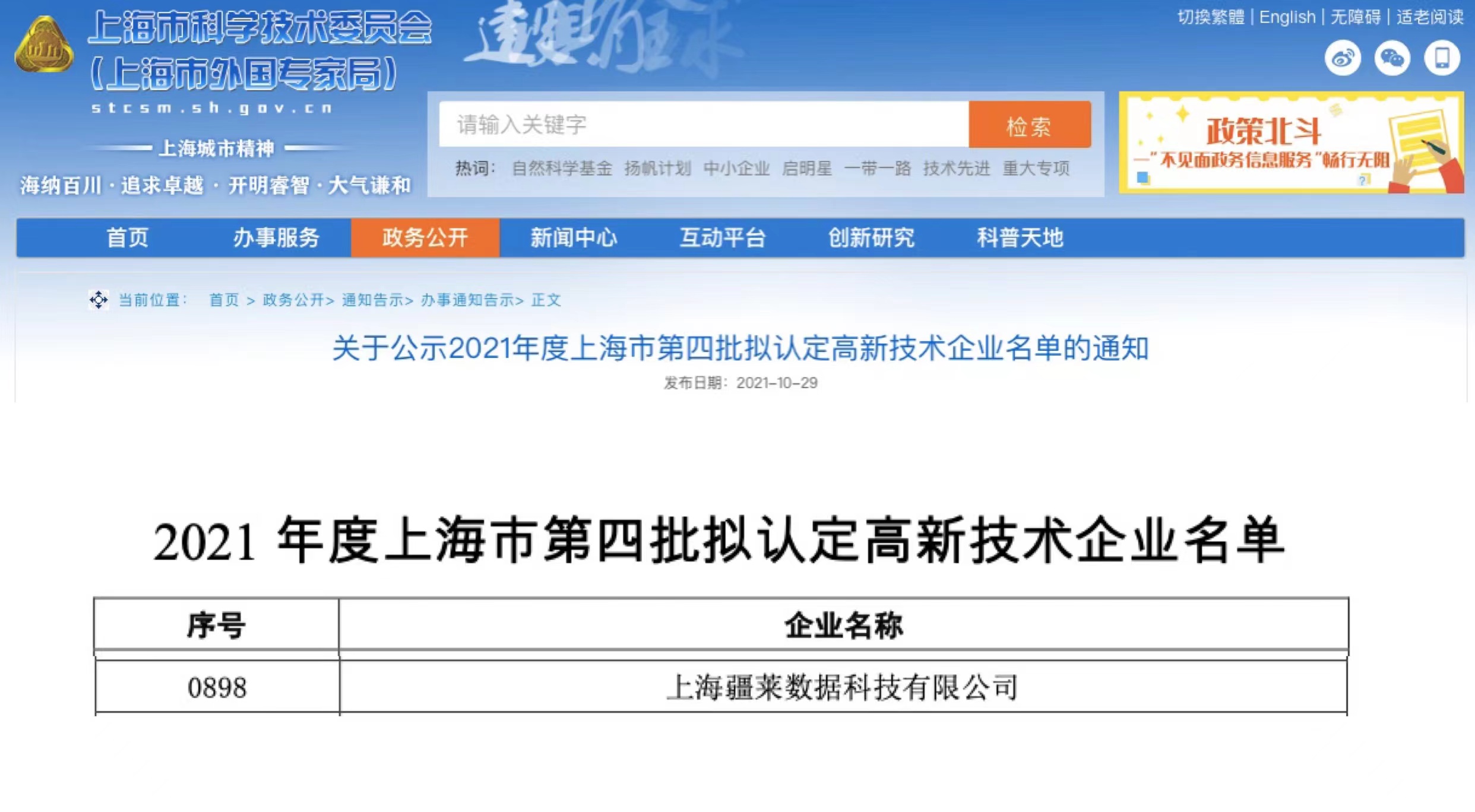 2021年10月29日,上海市科学技术委员会发布《关于公示2021年度上海市第四批拟认定高新技术企业名单的通知》,上海疆莱数据科技有限公司入围名单并通过公示,荣获国家高新技术企业认定。